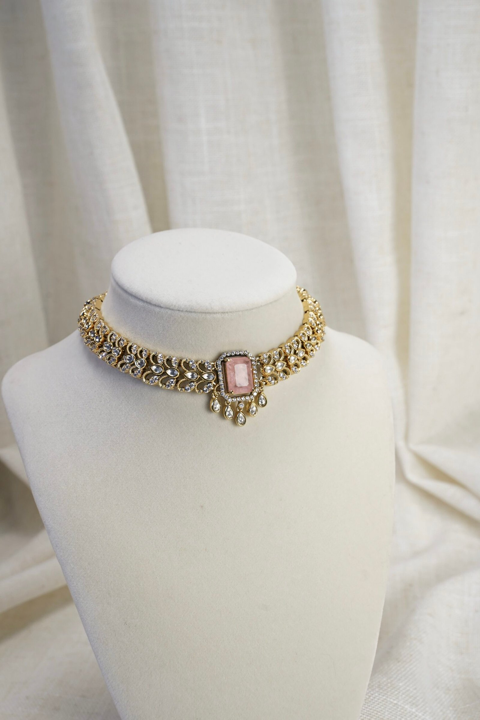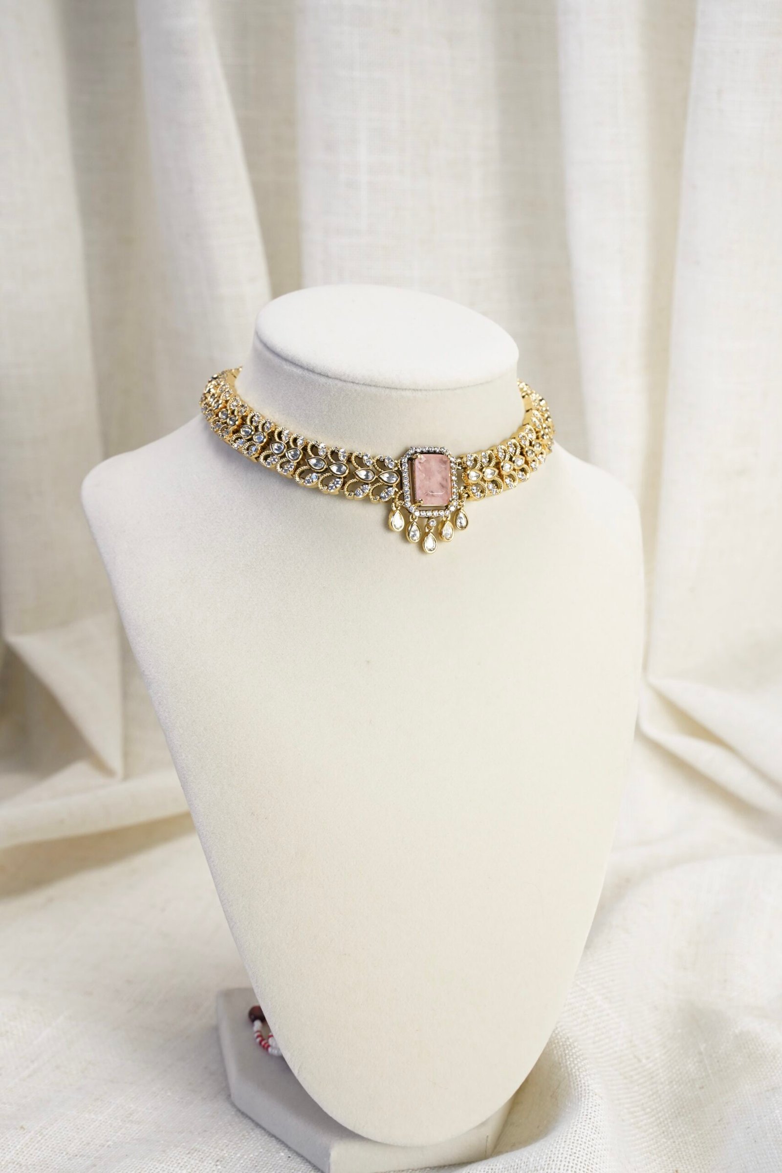 A premium necklace set from our exclusive collection, featuring a stone-detailed centerpiece and a soft light-gold finish.