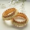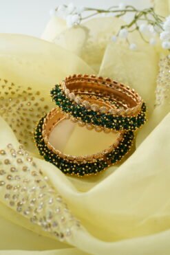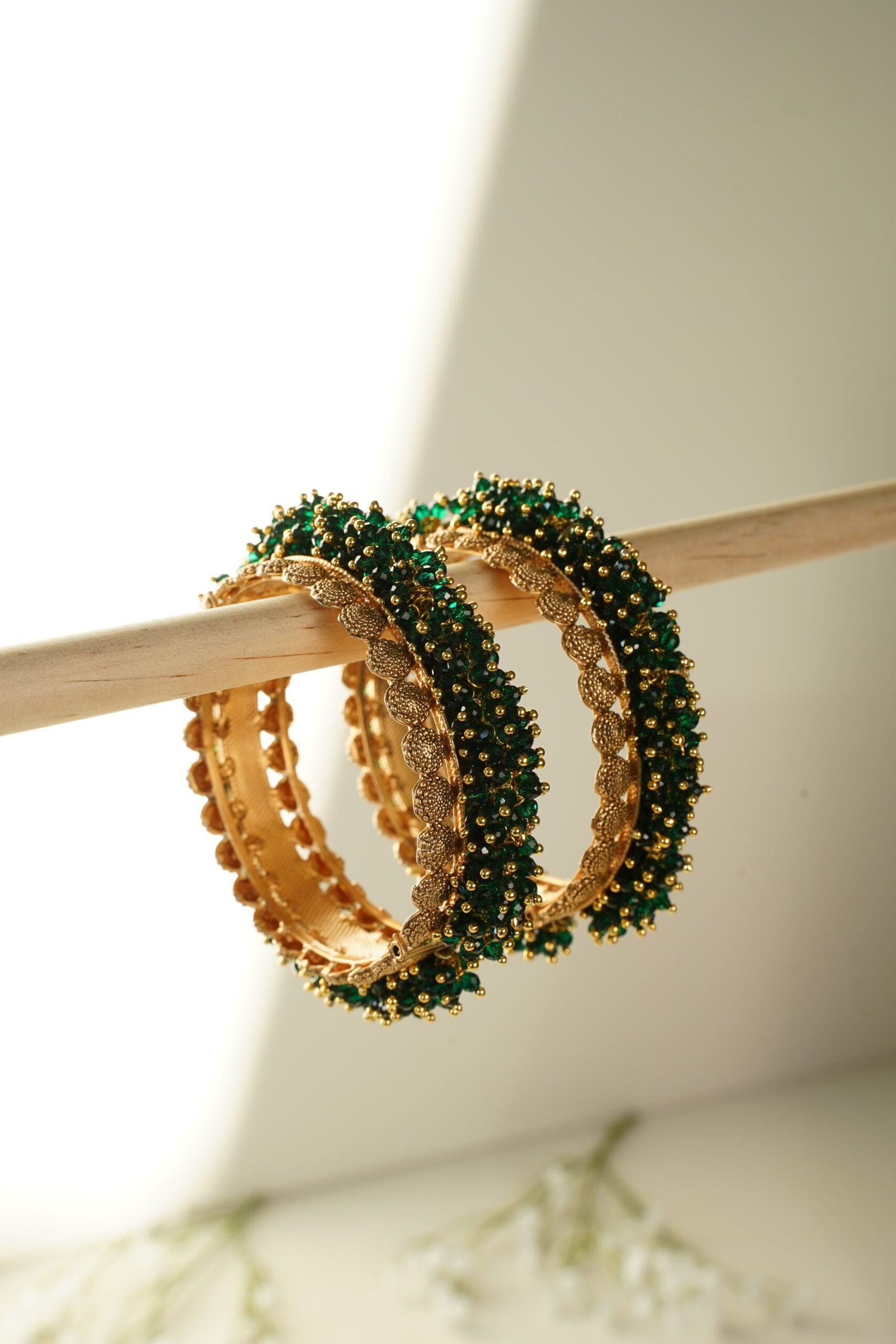 A statement chunky bangle set with a screw opener, designed with green crystal beaded clusters and dainty circular detailing around the edge.