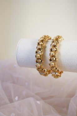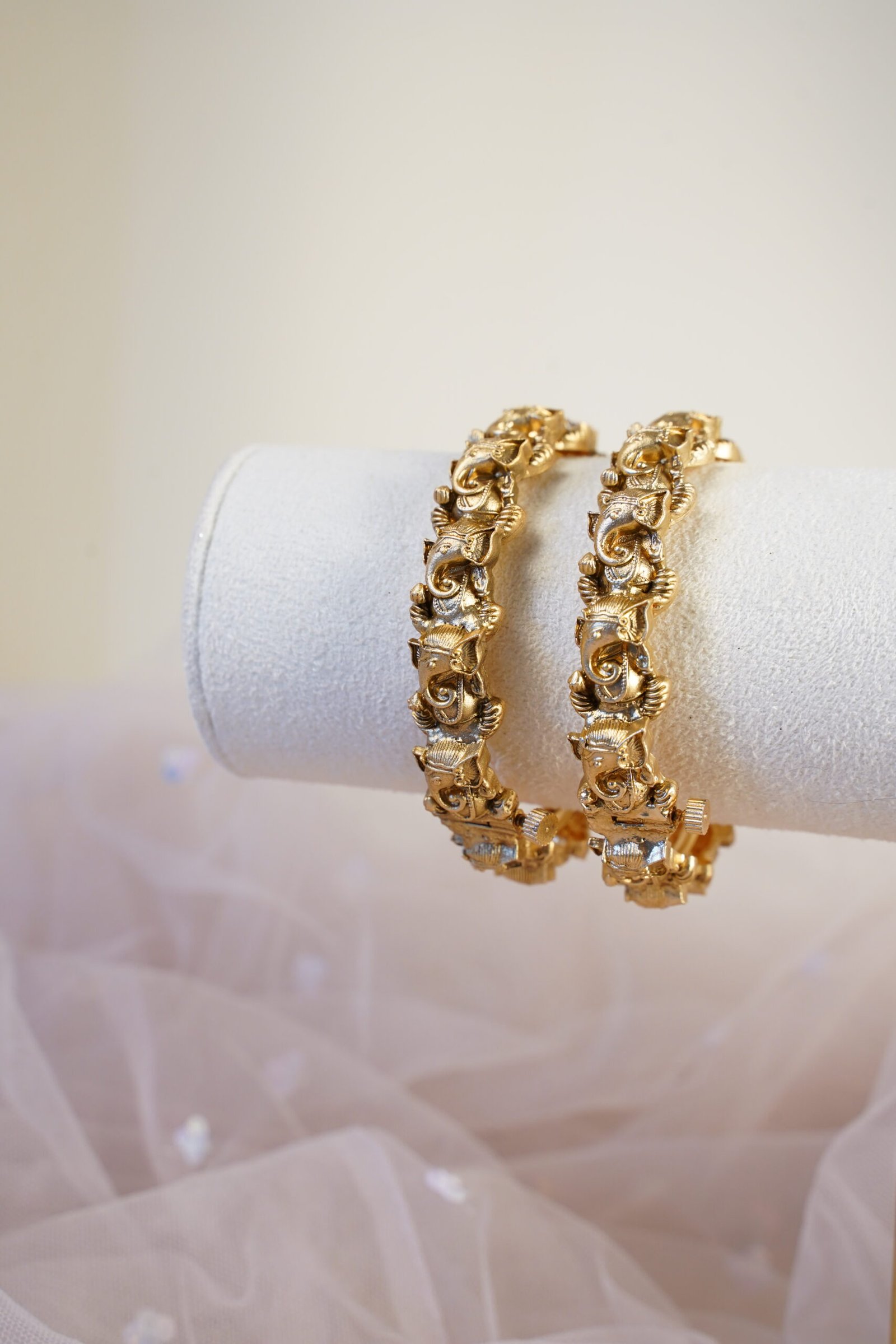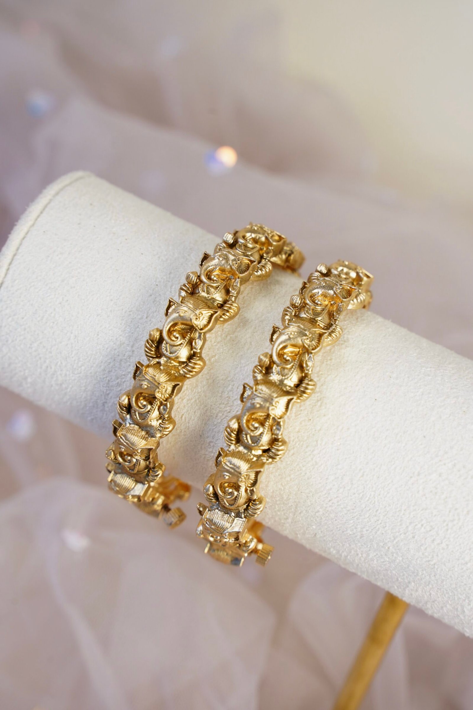 A Ganesha-inspired bangle set with intricate detailing and a secure screw closure.