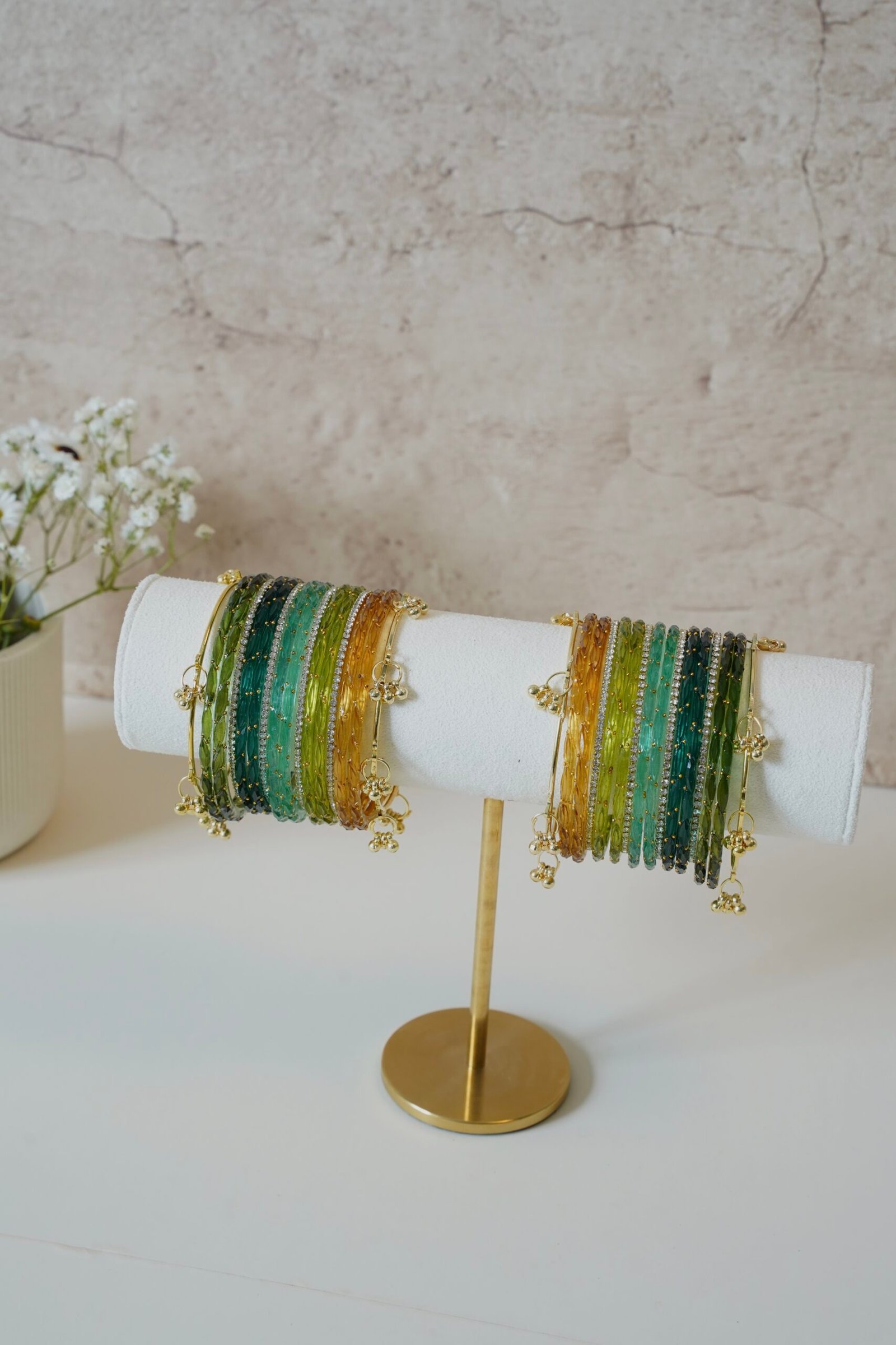 This forest-inspired Kashmiri raindrop glass bangle stack features refreshing hues of light green, mehndi green, mint, and soft yellow, capturing the serene beauty of nature. The set includes bangles for both arms, making it perfect for weddings, mehendi, festive occasions, or adding a vibrant ethnic touch.