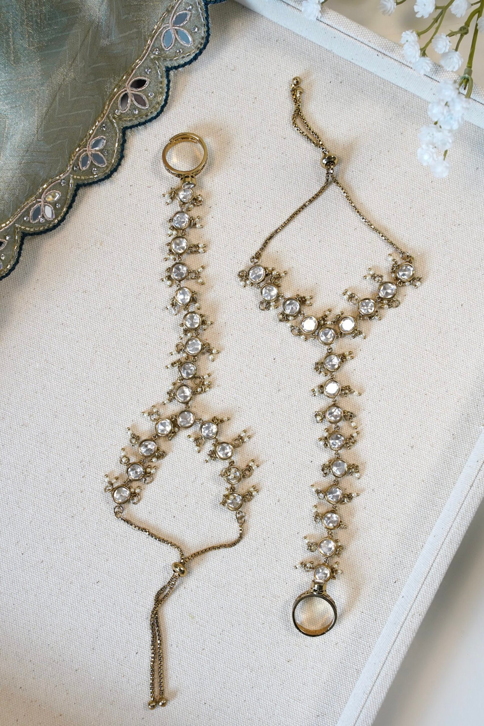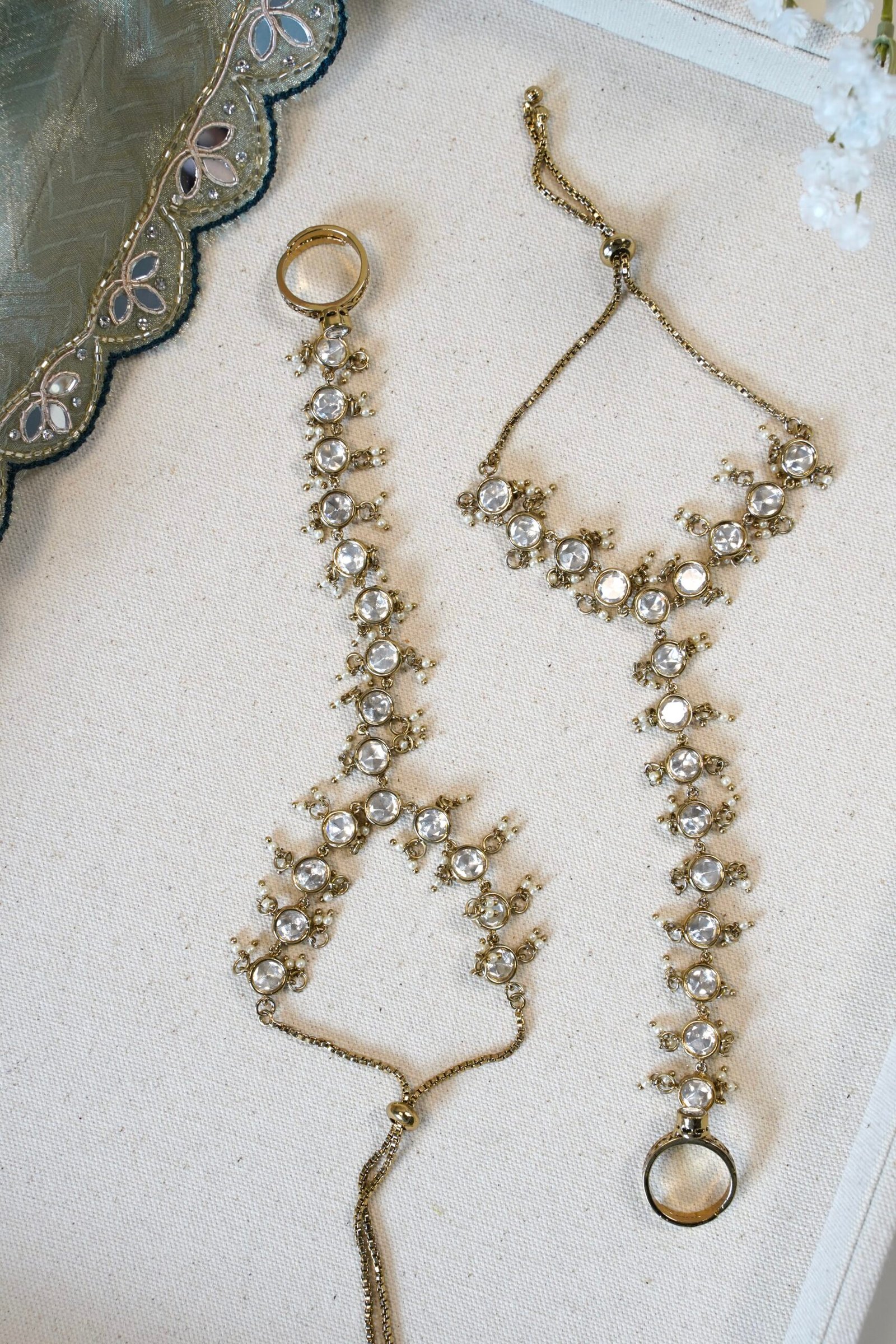 Elegant haathphool featuring continuous kundan detailing that flows seamlessly from the wrist to the ring.