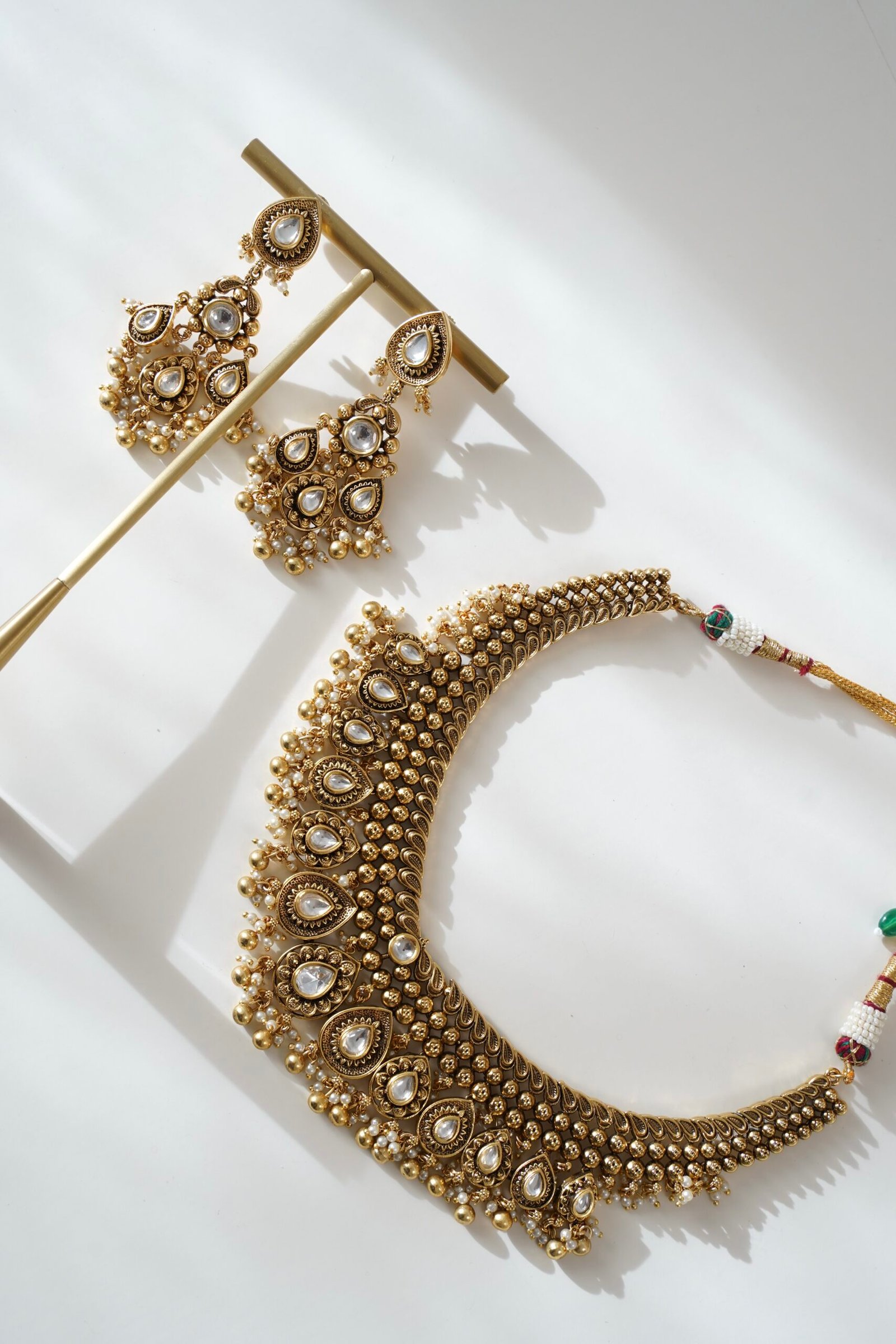 A royal-inspired kundan necklace set in gold tone, beautifully finished with delicate pearl drops and matching earrings for an elegant statement.