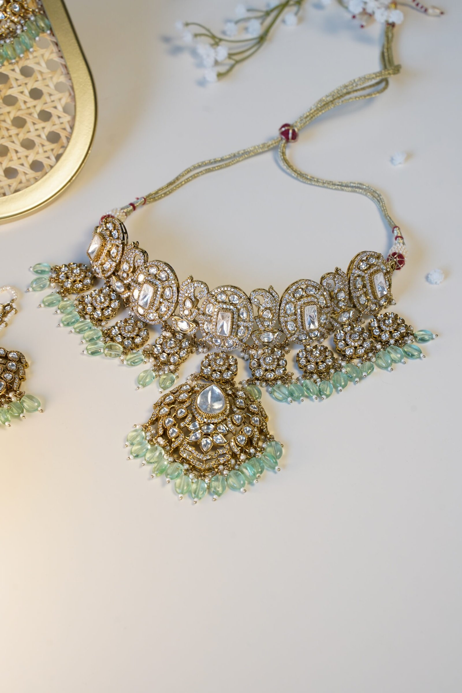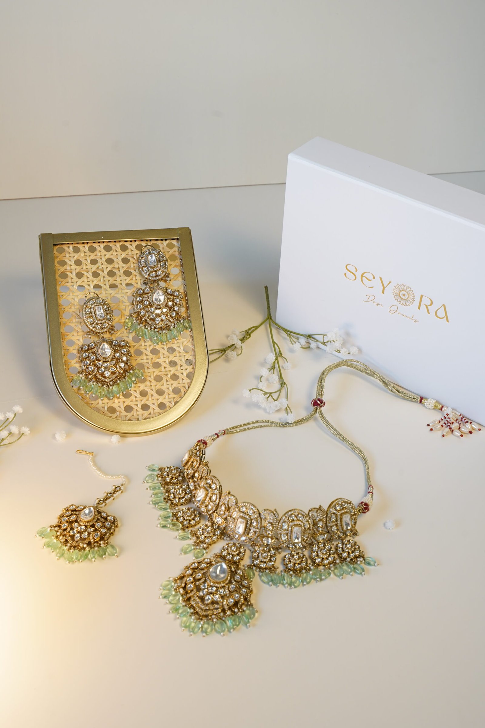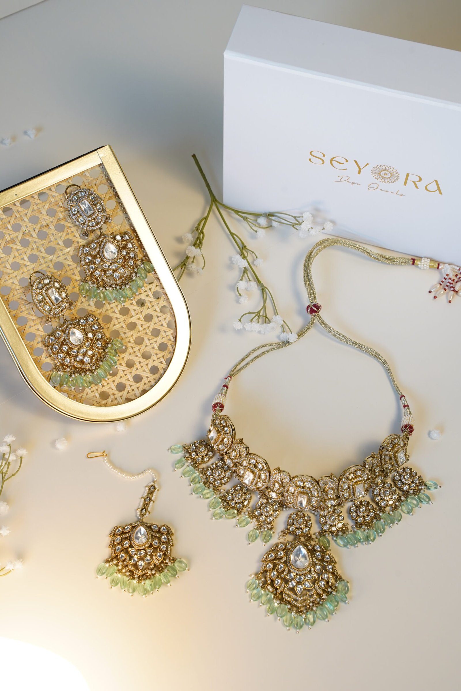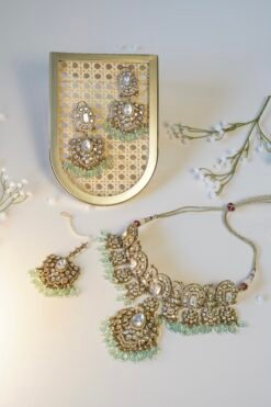 A modern bride’s dream. Intricate stone detailing, uncut polki, and an adjustable necklace combine with matching earrings and tikka for a look that’s regal yet contemporary.