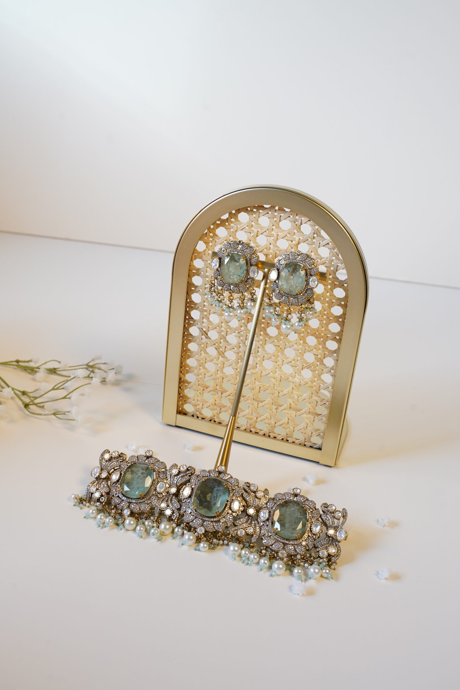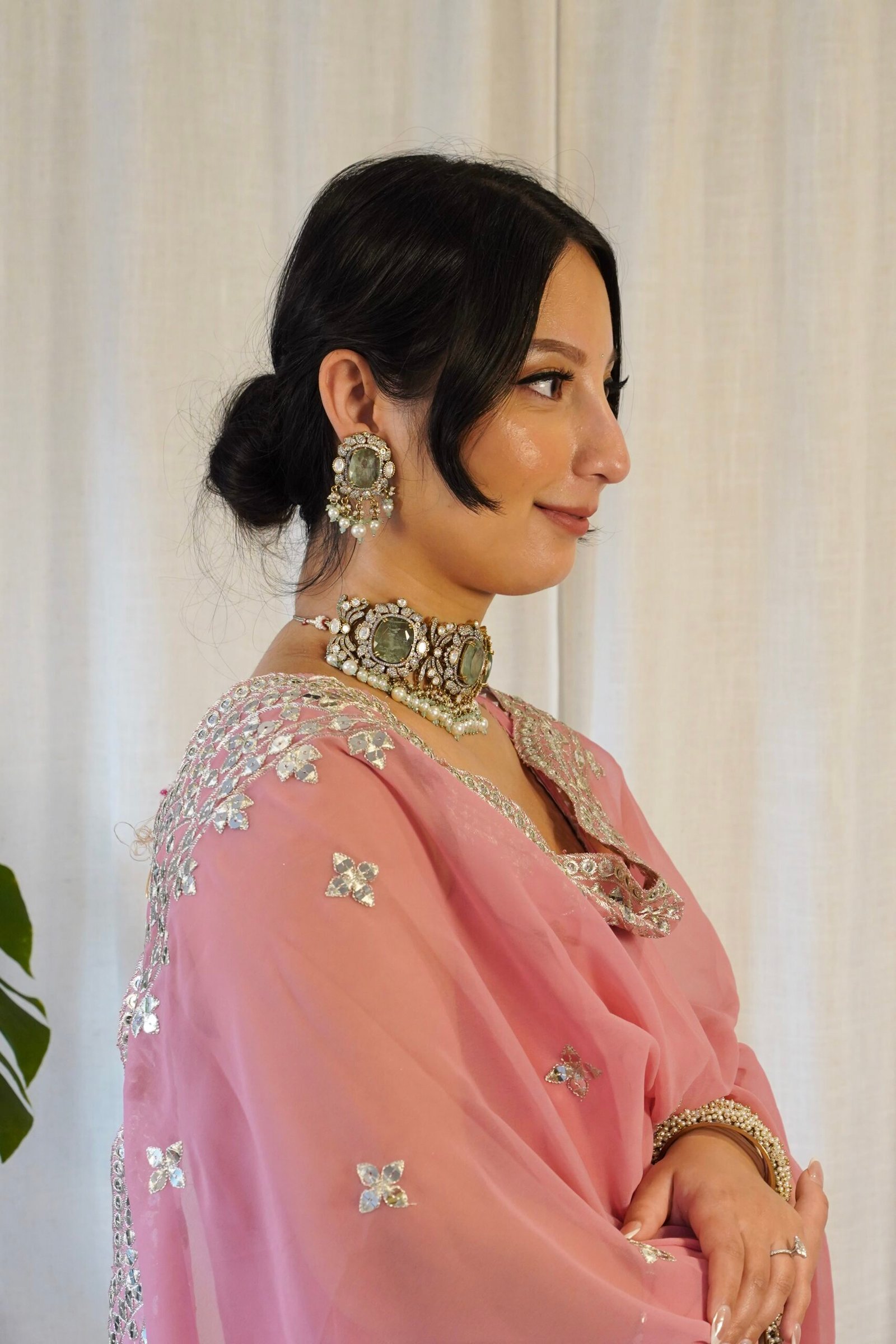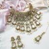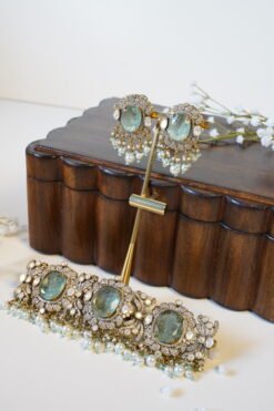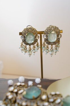 Make a statement with this exclusive mint-color Kundan choker set. Featuring bold uncut Kundan stones, delicate pearl detailing, an adjustable fit, and matching earrings, it’s perfect for those who love to stand out.