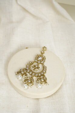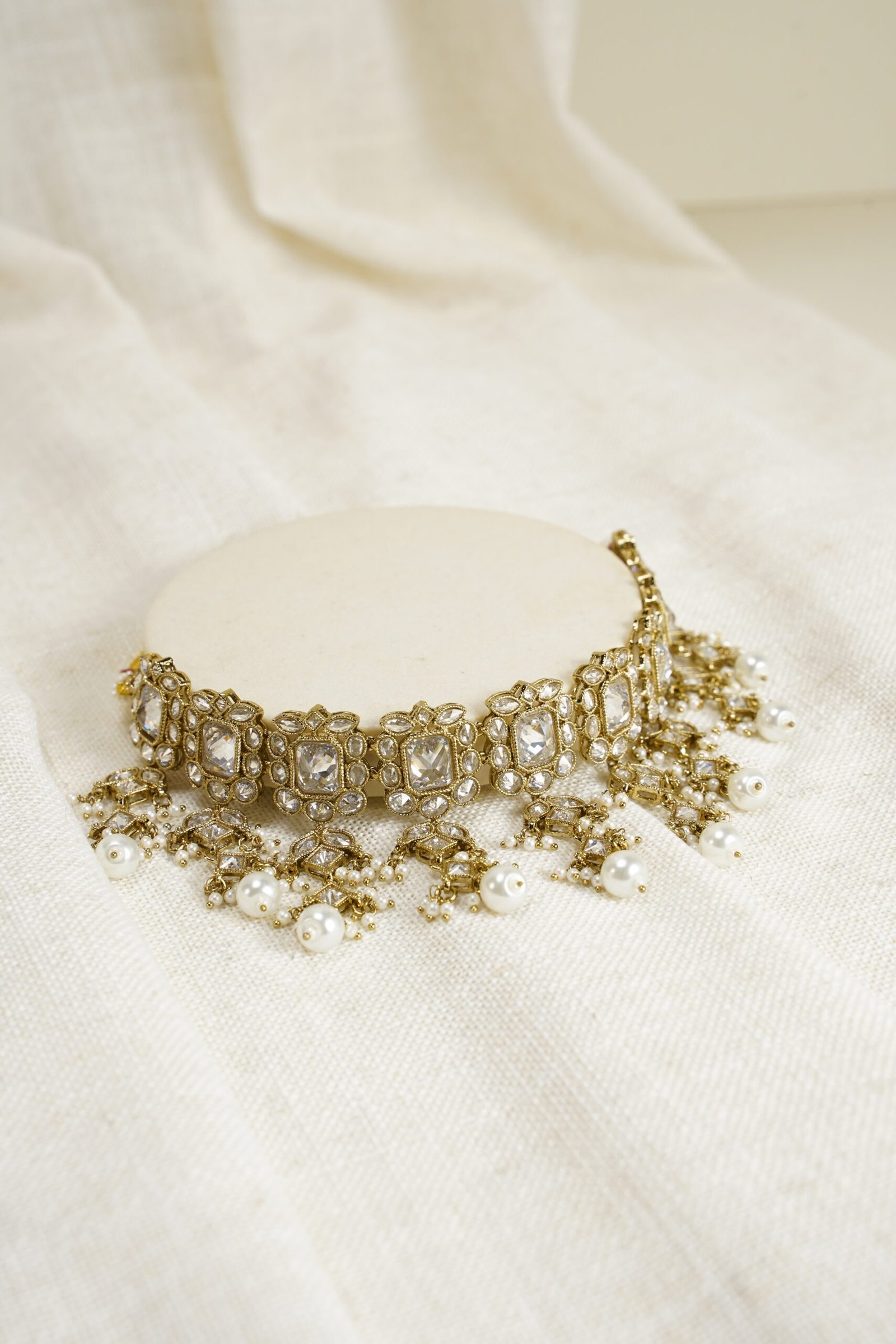 This adjustable, easy-to-wear necklace set is lightweight and flexible, perfect for long wear. Includes matching earrings and a tikka.