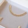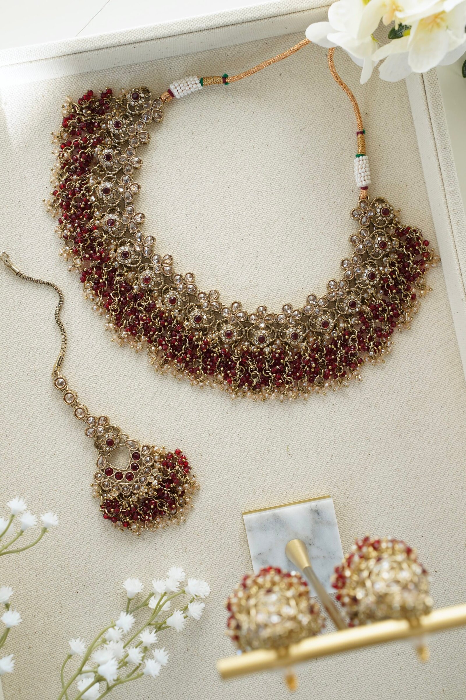 The necklace features an adjustable dori/drawstring closure, allowing for a comfortable and customizable fit. Paired with matching jhumka earrings and a coordinating tikka, this complete set is designed to create a cohesive and statement-worthy look for special occasions. Style it effortlessly with lehengas, sarees, shararas, anarkalis, or modern ethnic ensembles.