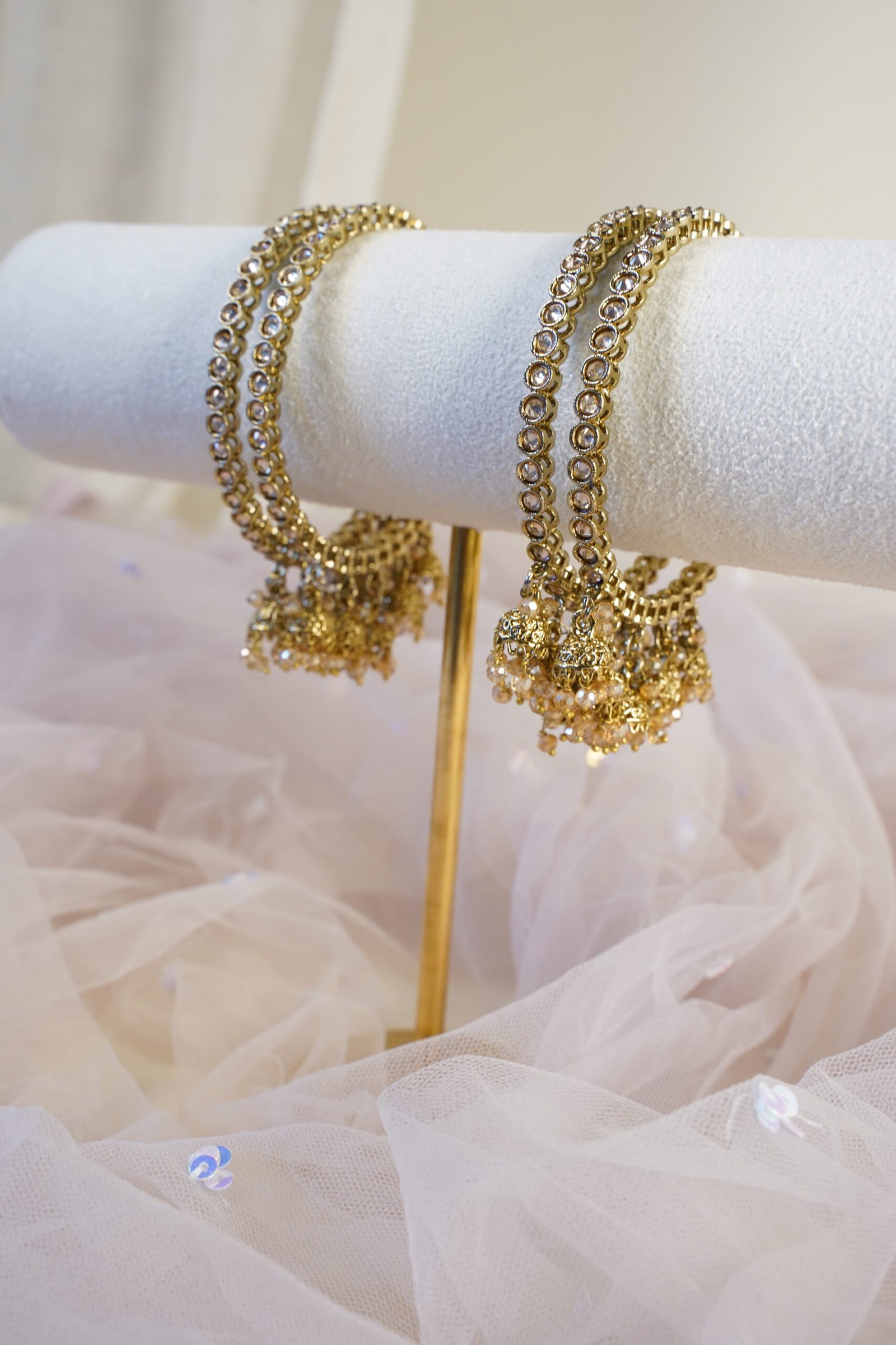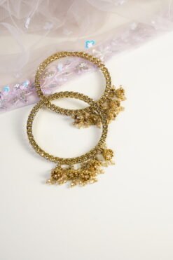 A set of four bangles featuring tiny crystal jhumkas and gold stone detailing—perfect for adding just the right amount of character to your bangle stack